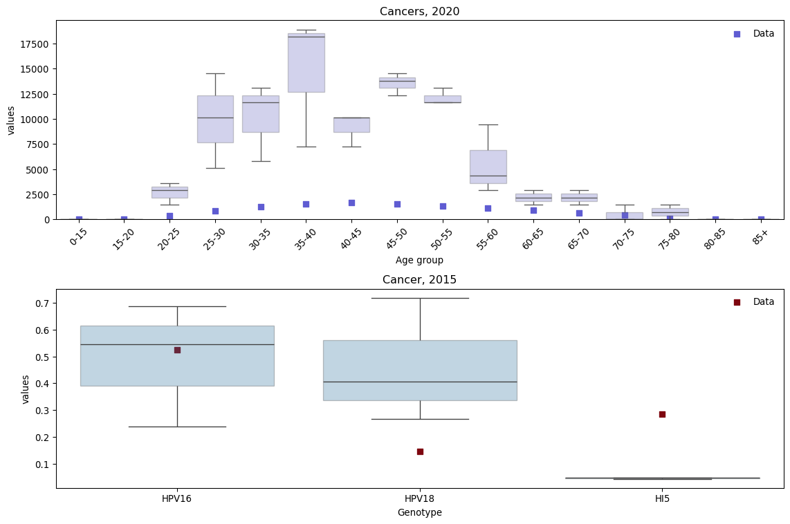 Data on HPV and cervical disease comes in many different formats. When using HPVsim, the goal is typically to produce population-level estimates of epidemic outputs like: - age-specific incidence of cancer or high-grade lesions in one or more years; - number of cases of cancer or high-grade lesions reported in one or more years; - HPV prevalence over time; - lifetime incidence of HPV; - the distribution of genotypes in detected cases of cancer/high-grade lesions; - sexual behavior metrics like the average age at first marriage, duration of relationships, or number of lifetime partners.