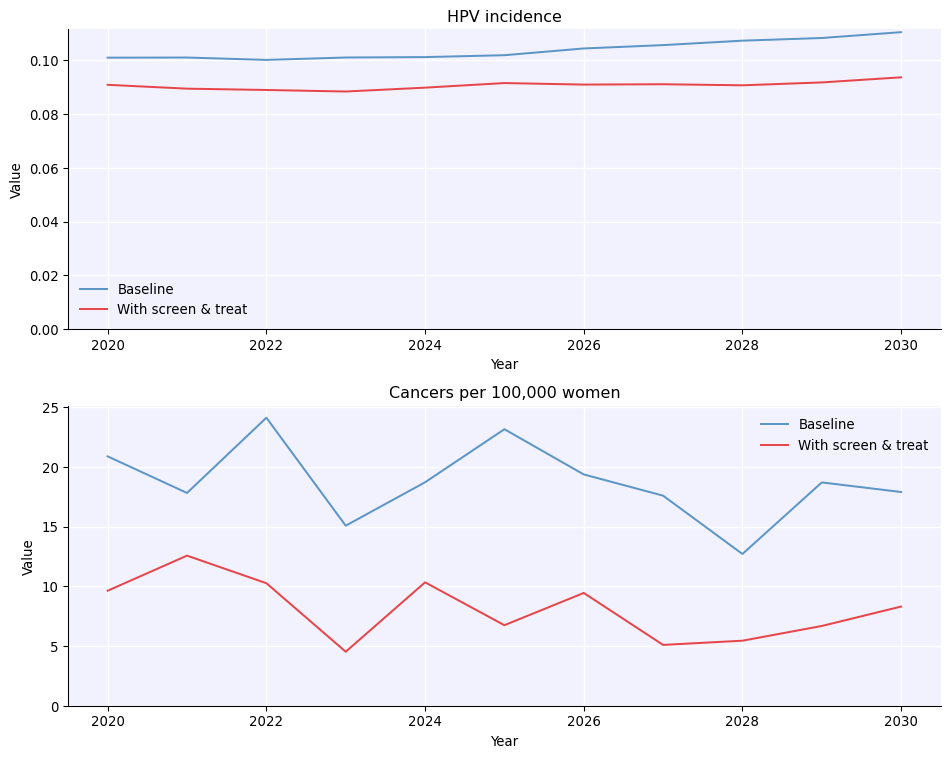 # Define a series of interventions to screen, triage, assign treatment, and administer treatmentprob =0.6screen = hpv.routine_screening(start_year=2015, prob=prob, product='via', label='screen') # Routine screeningto_triage =lambda sim: sim.get_intervention('screen').outcomes['positive'] # Define who's eligible for triagetriage = hpv.routine_triage(eligibility=to_triage, prob=prob, product='hpv', label='triage') # Triage peopleto_treat =lambda sim: sim.get_intervention('triage').outcomes['positive'] # Define who's eligible to be assigned treatmentassign_tx = hpv.routine_triage(eligibility=to_treat, prob=prob, product='tx_assigner', label='assign_tx') # Assign treatmentto_ablate =lambda sim: sim.get_intervention('assign_tx').outcomes['ablation'] # Define who's eligible for ablation treatmentablation = hpv.treat_num(eligibility=to_ablate, prob=prob, product='ablation') # Administer ablationto_excise =lambda sim: sim.get_intervention('assign_tx').outcomes['excision'] # Define who's eligible for excisionexcision = hpv.treat_delay(eligibility=to_excise, prob=prob, product='excision') # Administer excision# Define the parameterspars =dict( n_agents =20e3, # Population size n_years =35, # Number of years to simulate verbose =0, # Don't print details of the run rand_seed =2, # Set a non-default seed genotypes = [16, 18], # Include the two genotypes of greatest general interest)# Create the sim with and without interventionsorig_sim = hpv.Sim(pars, label='Baseline')sim = hpv.Sim(pars, interventions = [screen, triage, assign_tx, ablation, excision], label='With screen & treat')# Run and plotmsim = hpv.parallel(orig_sim, sim)msim.plot();