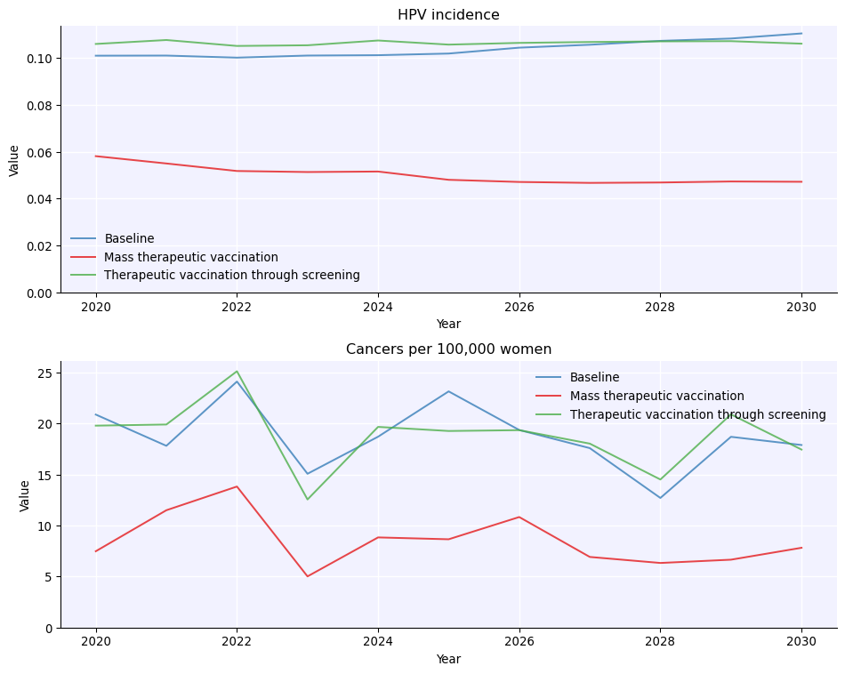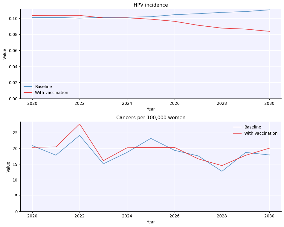 vx = hpv.routine_vx(prob=prob, start_year=2015, age_range=[9,10], product='bivalent')# Create the sim with and without interventionsorig_sim = hpv.Sim(pars, label='Baseline')sim = hpv.Sim(pars, interventions = vx, label='With vaccination')# Run and plotmsim = hpv.parallel(orig_sim, sim)msim.plot();