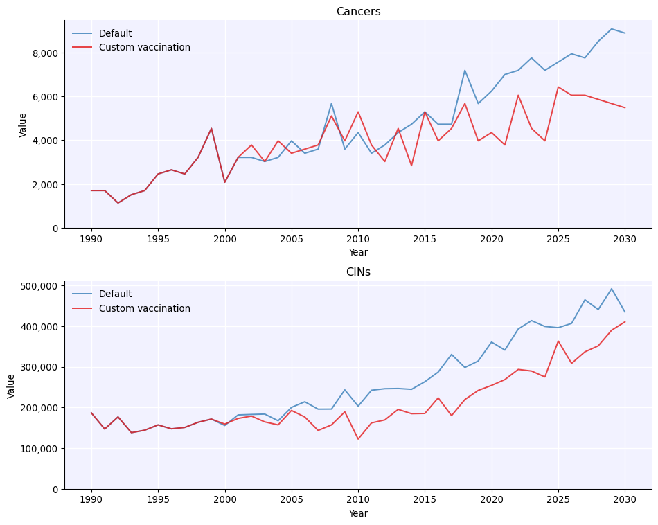 import hpvsim as hpv# Custom vaccination interventiondef custom_vx(sim):if sim.yearvec[sim.t] ==2000: target_group = (sim.people.age>9) * (sim.people.age<14) sim.people.peak_imm[0, target_group] =1pars =dict( location ='tanzania', # Use population characteristics for Japan n_agents =10e3, # Have 50,000 people total in the population start =1980, # Start the simulation in 1980 n_years =50, # Run the simulation for 50 years burnin =10, # Discard the first 20 years as burnin period verbose =0, # Do not print any output)# Running with multisims -- see Tutorial 3s1 = hpv.Sim(pars, label='Default')s2 = hpv.Sim(pars, interventions=custom_vx, label='Custom vaccination')msim = hpv.MultiSim([s1, s2])msim.run()fig = msim.plot(['cancers', 'cins'])